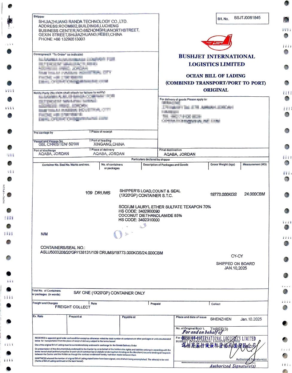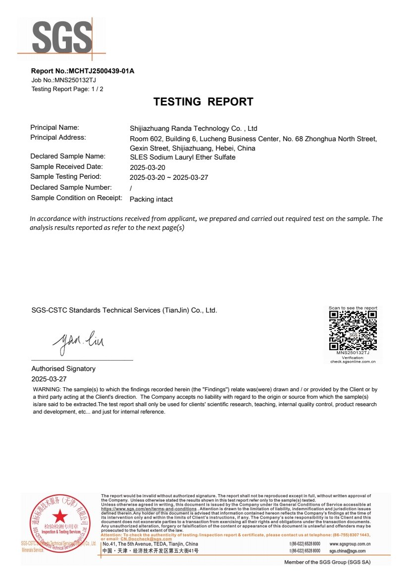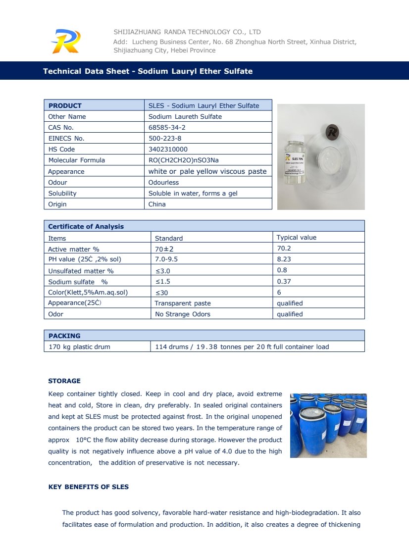 Shijiazhuang Randa Technology Co. , Ltd. is locatedin Hebei,Located in Hebei Province. It is close to Beijing, the capital of China, and the port city of Tianjin. We specialize in the production of eSurfactants and emulsifiers, the main products are SLES 70%,LABSA 96%,CAB-35,CDEA 95%,AEO(2、3、7、9) and other products, the annual total output of 500,000 tons. Our products are exported to more than 40 countries and regions around the world, and the annual export volume reaches hundreds of millions of US dollars. Our philosophy, mutual benefit, common development. Look forward to working with you!